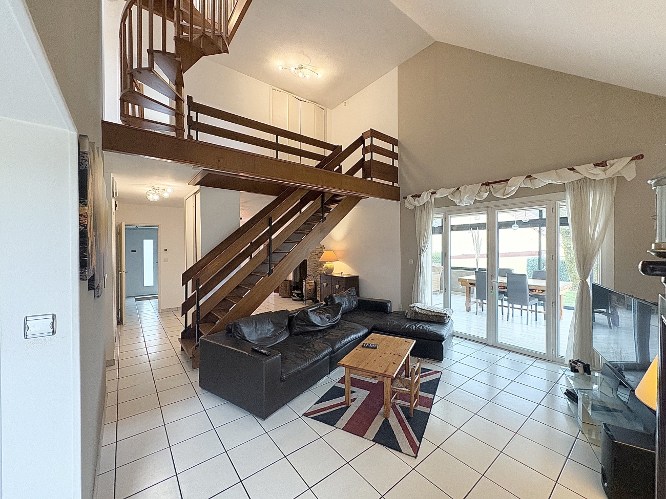 - Au RDC : une entrée avec placard, un dégagement, une cuisine équipée et meublée (lave-vaisselle, plaque, four, hotte, réfrigérateur, micro-ondes, meubles hauts et bas) donnant accès à la terrasse, ouverte sur grande pièce à vivre, une véranda de 21.60 m², un WC séparé et un accès garage.