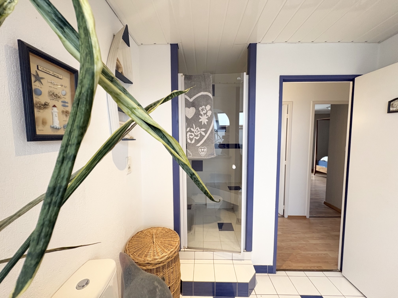 - Au 1er étage : une grande chambre de 17.30 m² avec placards, un bureau (<9m²), une salle de bains avec douche, baignoire et WC.