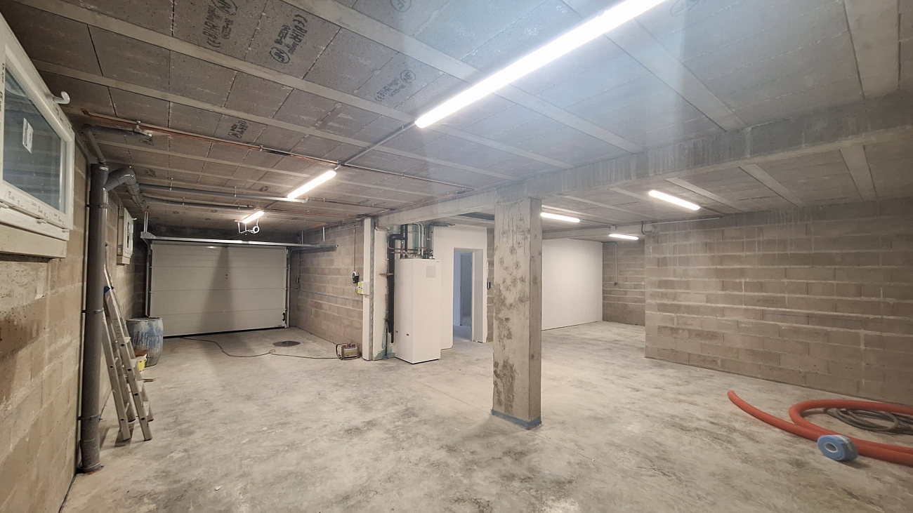 Sous-sol : Entrée indépendance desservant un hall d'entrée, une vaste pièce, un garage (porte motorisée) deux véhicules, espace buanderie, espace chaufferie.