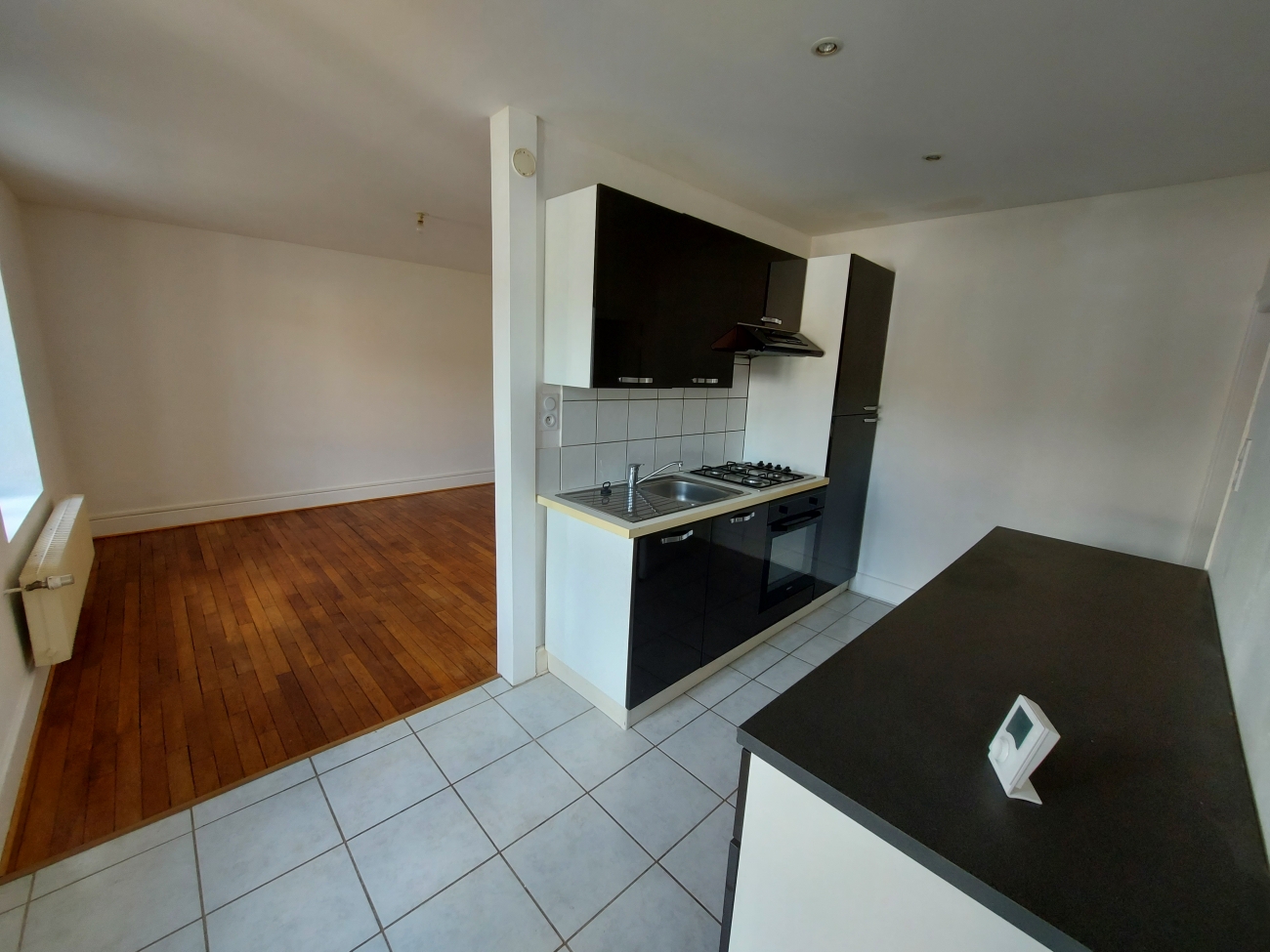 Une entrée, une cuisine équipée (plaques de cuisson gaz , réfrigérateur, four, hotte) un séjour de 13m2 environ,, une salle de bains, un WC,
