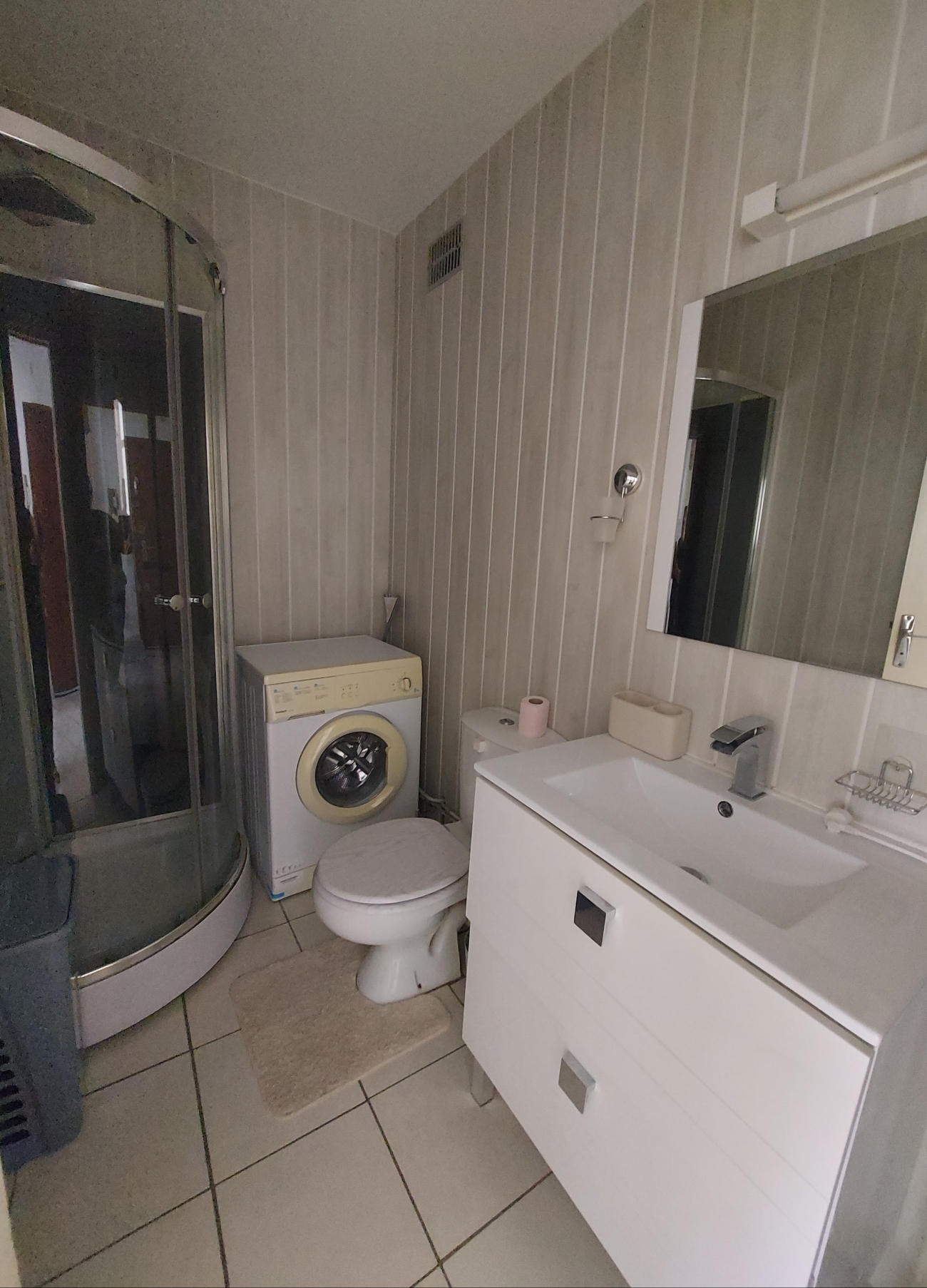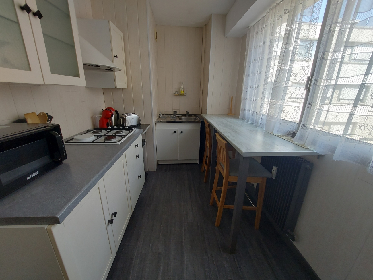 Situé dans une copropriété sécurisée, au deuxième étage avec ascenseur, il comprend une entrée avec placard, une cuisine équipée d'une plaque de cuisson gaz, un réfrigérateur, un four, un micro ondes, une chambre, un séjour, une salle d'eau avec WC et machine à laver.