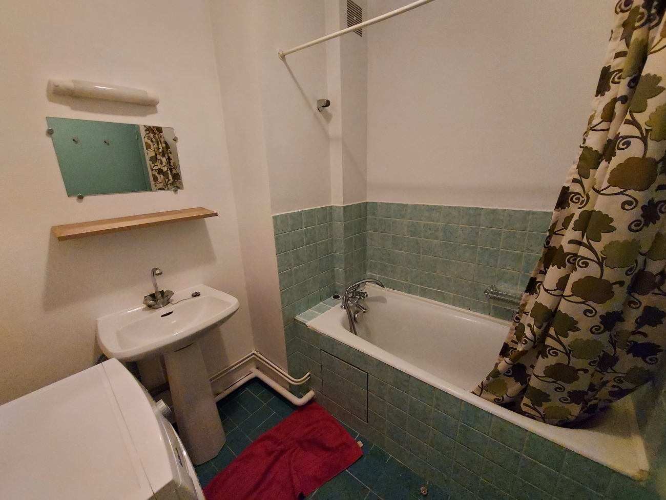 Une entrée avec rangements, espace kitchenette (micro-ondes/plaque/top/vaisselle…), une lumineuse pièce à vivre (banquette KZ, bureau, penderie…), salle de bains (baignoire, machine à laver & WC).