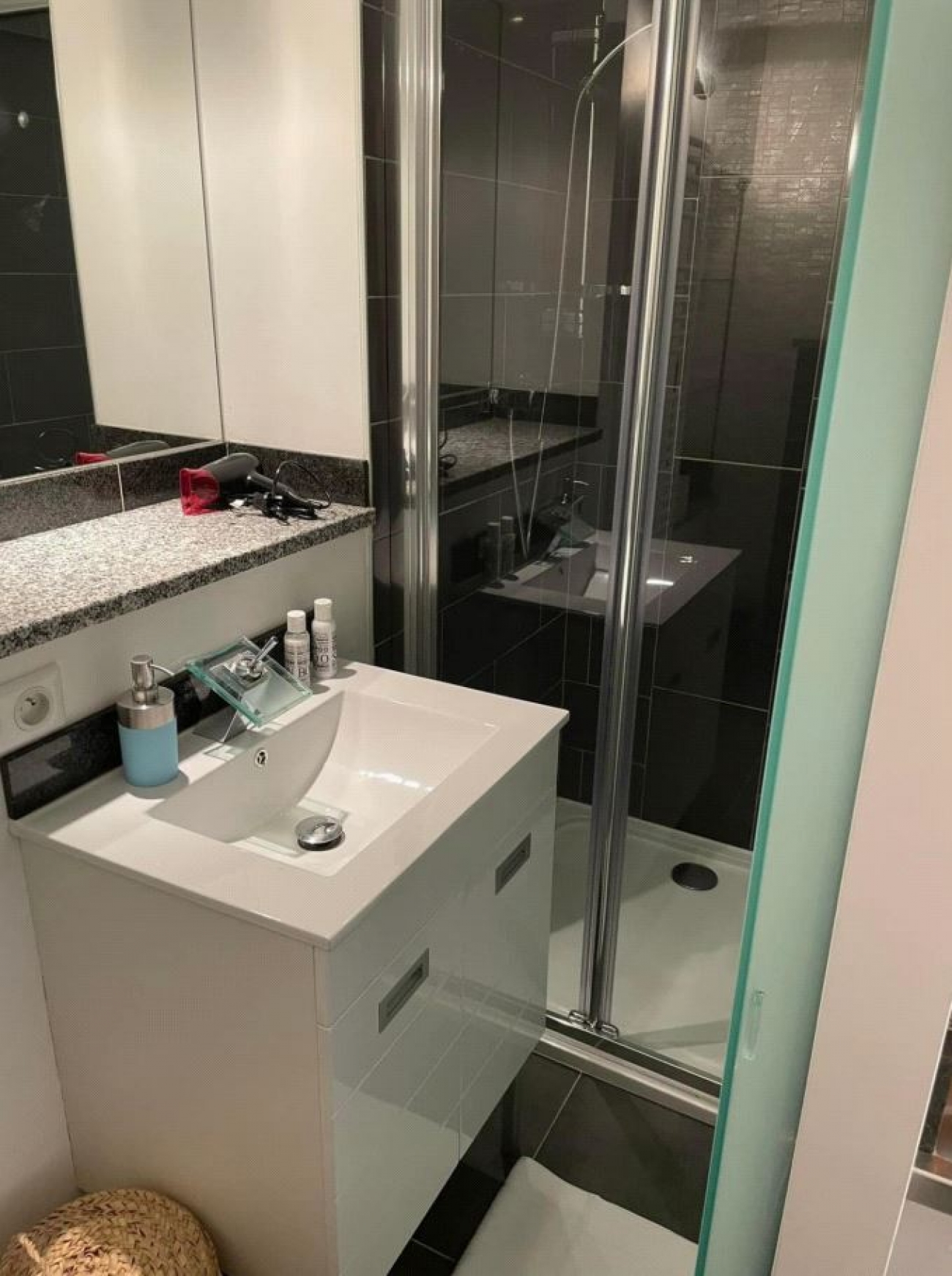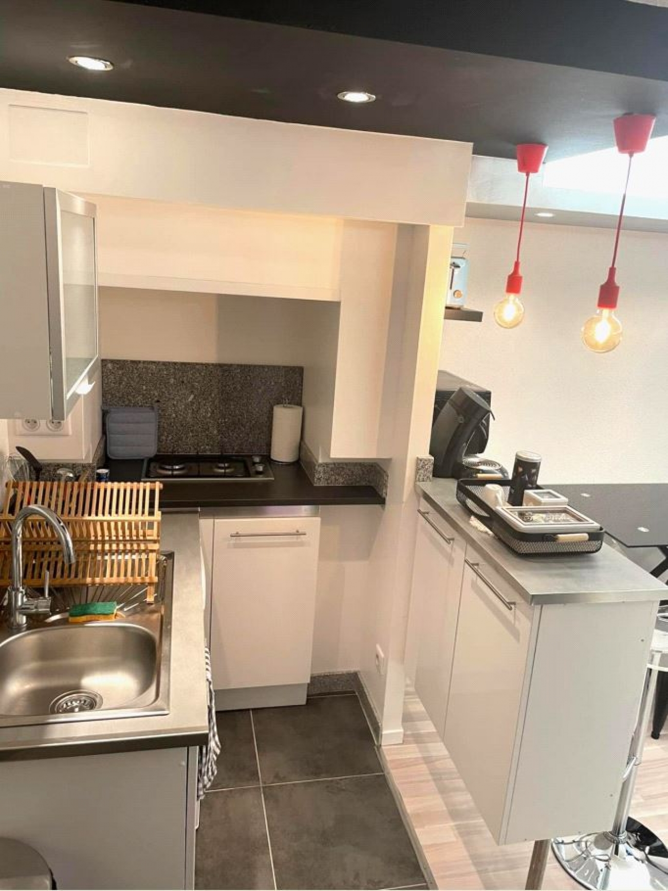 Une entrée sur vaste pièce à vivre meublée avec rangements (banquette KZ, bureau, TV…) ouverte sur un espace cuisine meublé & équipé (micro-ondes/plaques gaz/top…), une salle d\'eau (douche, machine à laver, rangements) & WC suspendus.