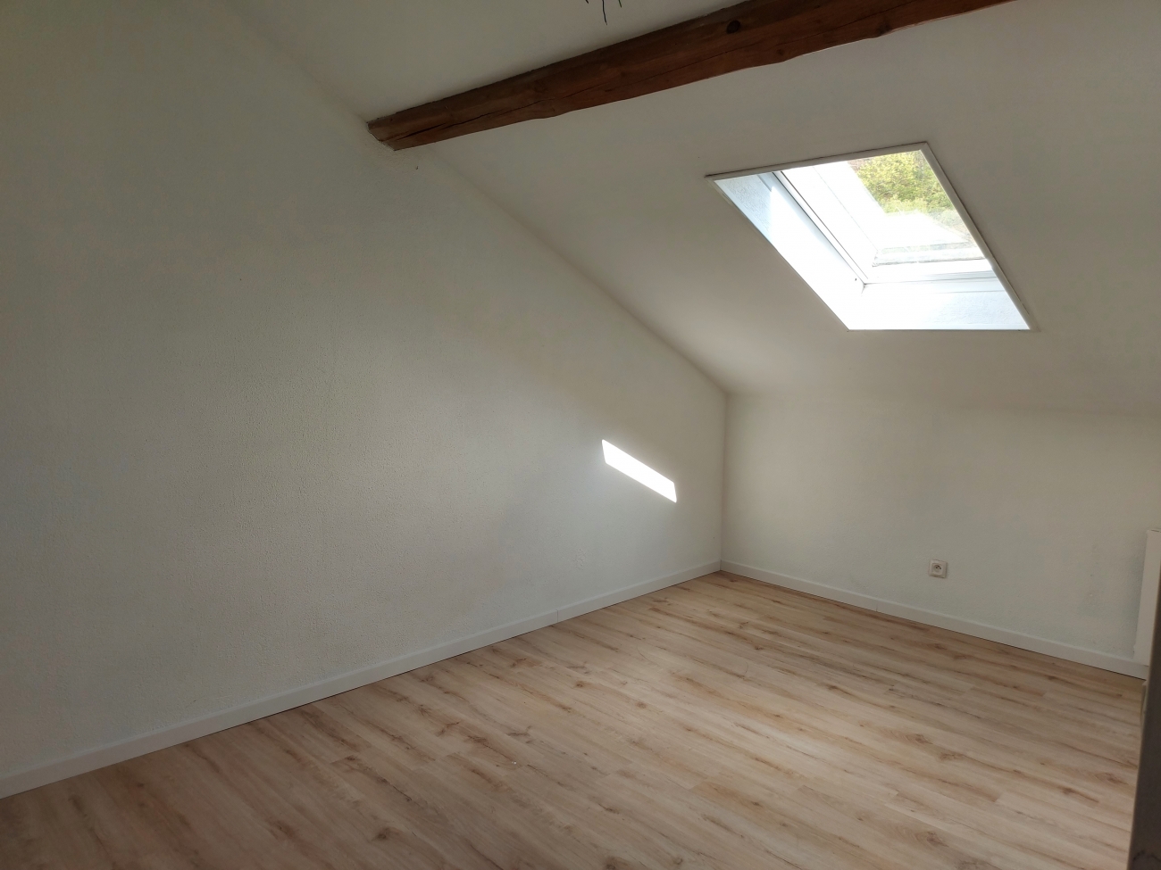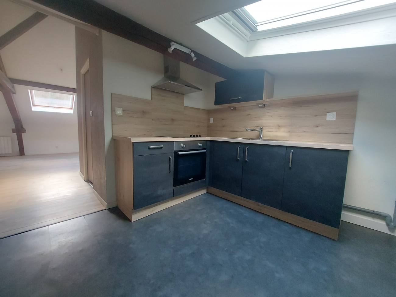 Une pièce de vie lumineuse avec poutres apparentes, une cuisine équipe (plaque, hotte, four) semi ouverte sur pièce de vie, une chambre, une salle de bains avec WC.