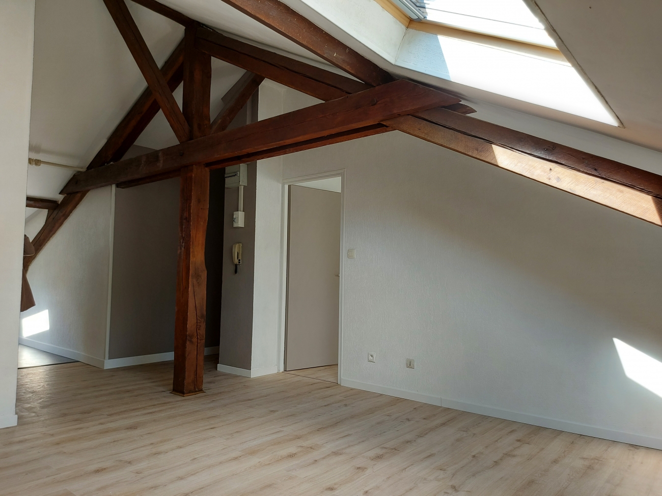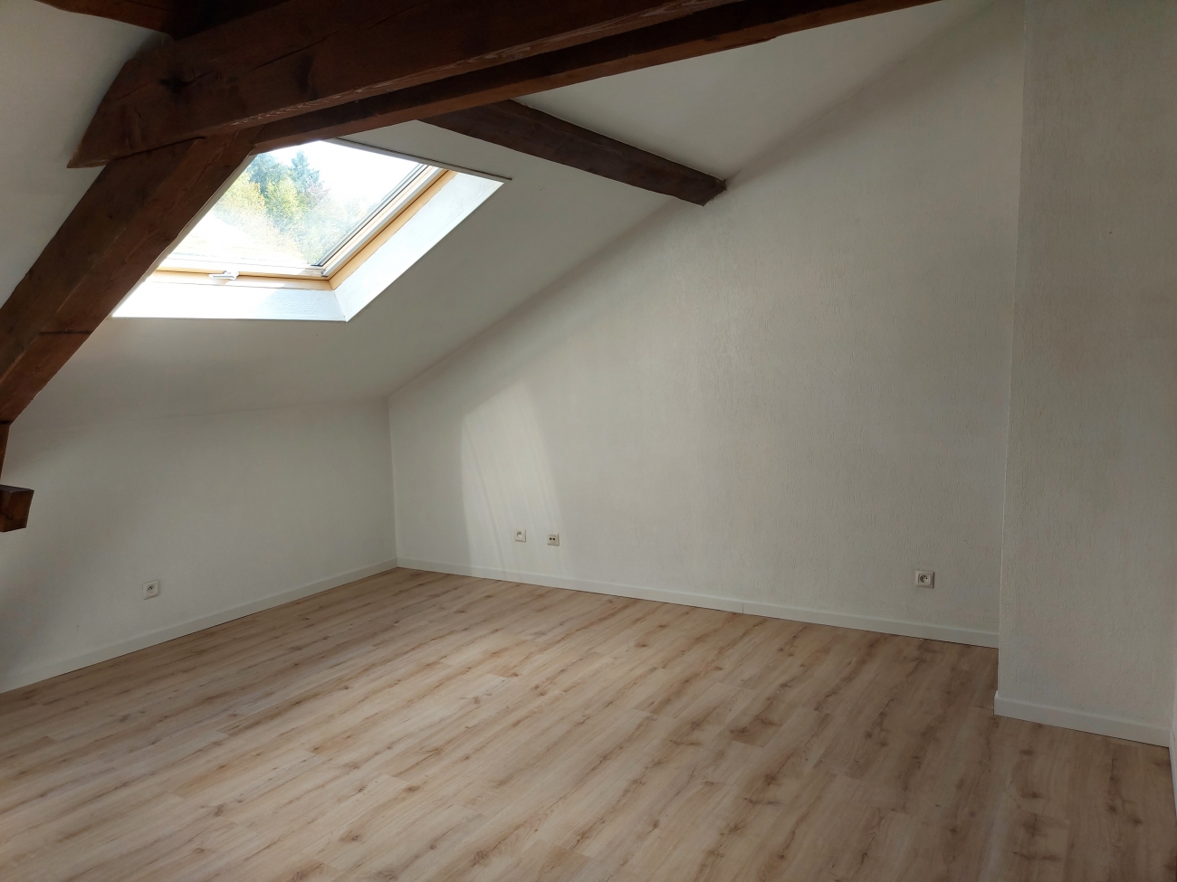 Une pièce de vie lumineuse avec poutres apparentes, une cuisine équipe (plaque, hotte, four) semi ouverte sur pièce de vie, une chambre, une salle de bains avec WC.