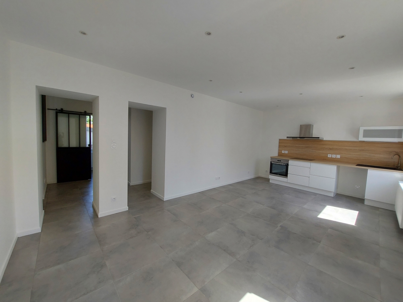 Appartement d'environ 59 m2 en rez-de-chaussée surélevé, offrant une entrée, une cuisine équipée ouverte sur séjour de 24 m2, deux chambres de 10.50m2 et 9.60m2 avec placards, un espace buanderie, une salle d'eau, un WC.